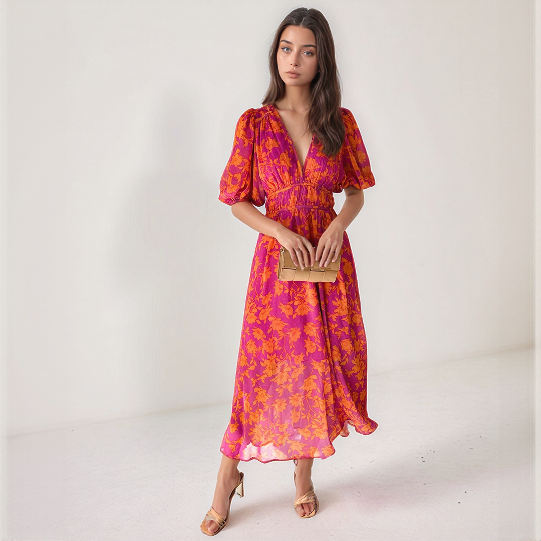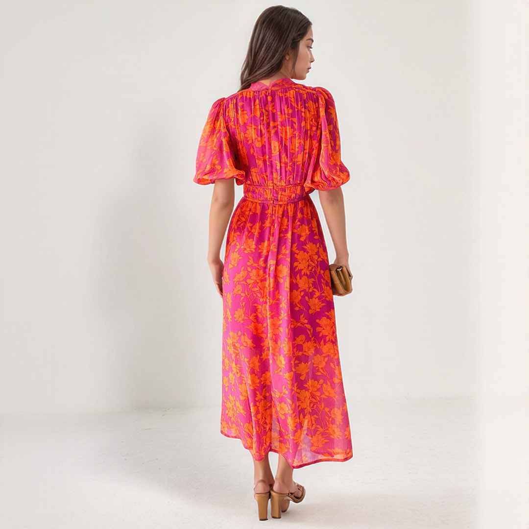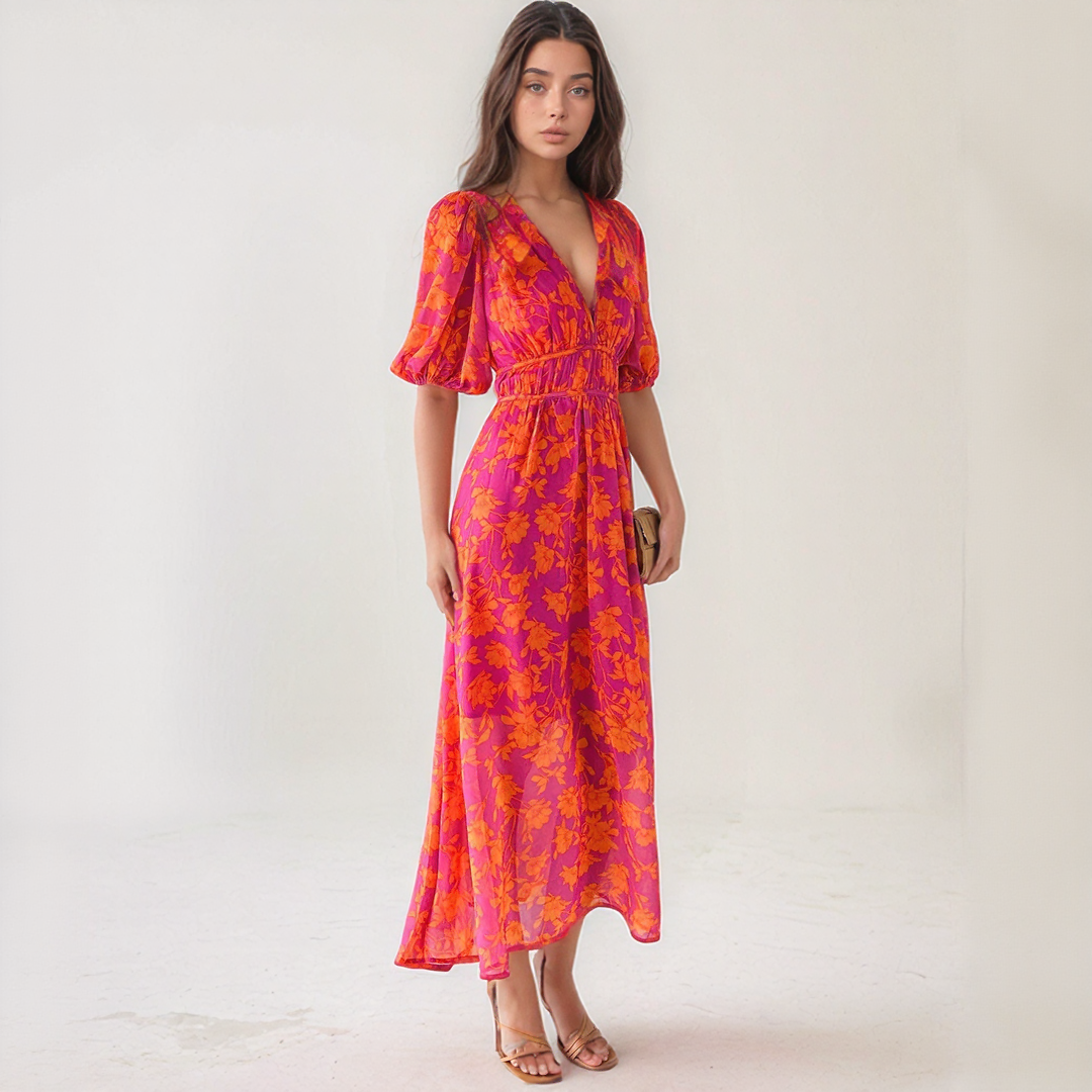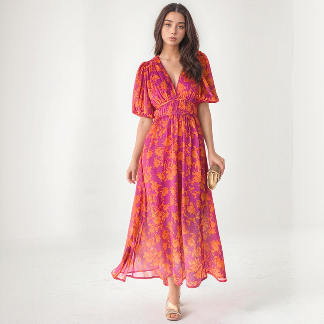Infuse your summer style with vibrant energy in the Solara Bloom Puff Sleeve Maxi Dress. Featuring a bold floral print, breezy silhouette, and a smocked waist for easy elegance, this radiant piece is perfect for garden parties, coastal escapes, or sunlit city strolls. Designed to move with you, it blends playful femininity with everyday comfort.